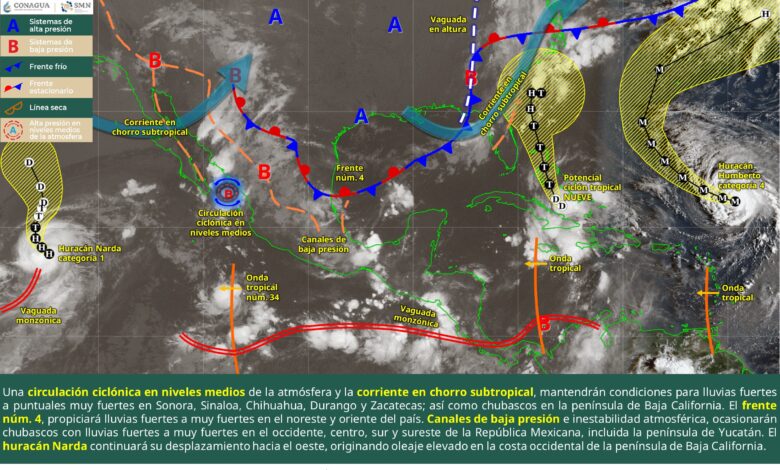 Este día, una circulación ciclónica en niveles medios de la atmósfera sobre el sur del golfo de California y la corriente en chorro subtropical, mantendrán condiciones para lluvias fuertes a puntuales muy fuertes en Sonora, Sinaloa, Chihuahua, Durango y Zacatecas; así como chubascos en la península de Baja California. Por otra parte, el frente núm. 4 se extenderá desde el golfo de México hasta el centro de Veracruz, propiciando lluvias fuertes a muy fuertes en el noreste y oriente del país. A su vez, canales de baja presión en el interior del territorio mexicano e inestabilidad atmosférica, ocasionarán chubascos con lluvias fuertes a muy fuertes en el occidente, centro, sur y sureste de la República Mexicana, incluida la península de Yucatán. Asimismo, el huracán Narda continuará su desplazamiento hacia el oeste, originando oleaje elevado en la costa occidental de la península de Baja California. Finalmente, prevalecerá el ambiente cálido a caluroso en la mayor parte del territorio nacional; con temperaturas máximas de 35 a 40 °C en Baja California (noreste), Sonora (sur), Chihuahua (noreste), Sinaloa, Coahuila, Nuevo León, Tamaulipas, Guerrero, Oaxaca, Tabasco y Campeche.