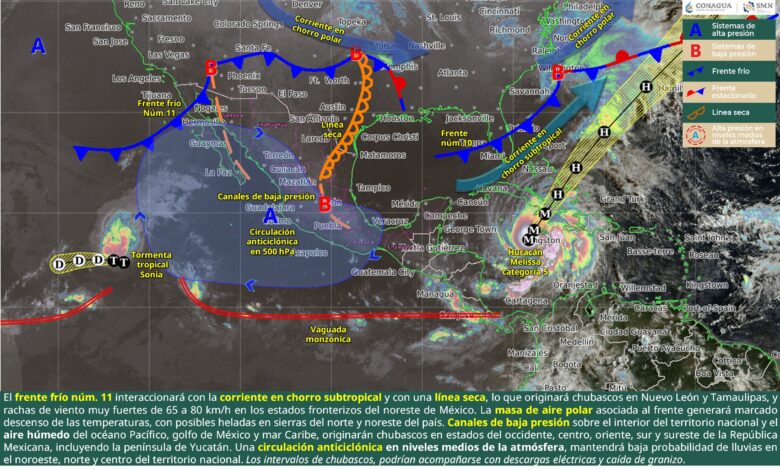 Para hoy, el frente frío núm. 11 que recorrerá el noroeste y norte de la República Mexicana, interaccionará con la corriente en chorro subtropical y con una línea seca, originarán chubascos en Nuevo León y Tamaulipas, y vientos con rachas muy fuertes de 65 a 80 km/h en los estados fronterizos del noreste de México. La masa de aire polar asociada al frente generará marcado descenso de las temperaturas, con posibles heladas en sierras del norte y noreste del país. Por su parte, canales de baja presión sobre el interior del territorio nacional, en combinación con el ingreso de aire húmedo del océano Pacífico, golfo de México y mar Caribe, originarán intervalos de chubascos en estados del occidente, centro, oriente, sur y sureste de la República Mexicana, incluyendo la península de Yucatán. Una circulación anticiclónica en niveles medios de la atmósfera mantendrá baja probabilidad de lluvias en el noroeste, norte y centro del territorio nacional. Finalmente, se pronostica durante la madrugada del miércoles, evento de “Norte” muy fuerte a intenso con rachas de 85 a 100 km/h y oleaje de 2.0 a 3.0 metros de altura en la costa norte de Tamaulipas.