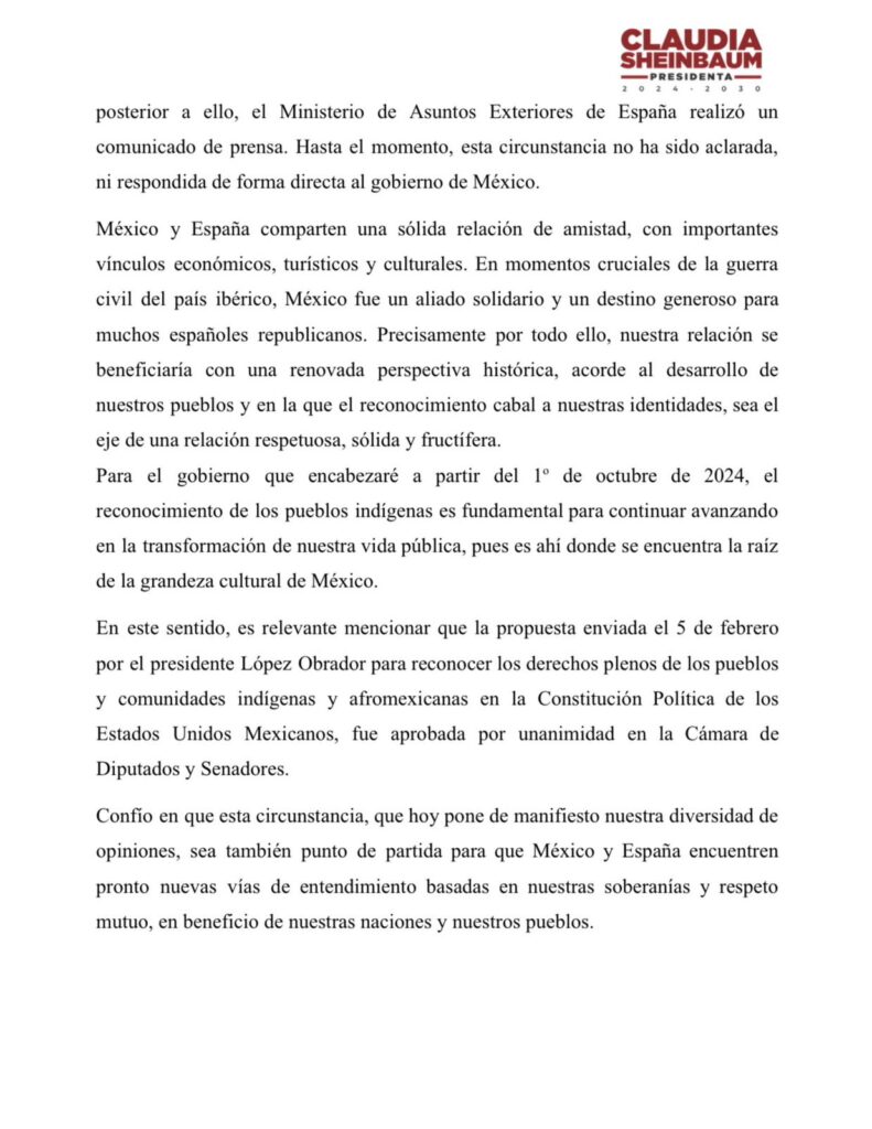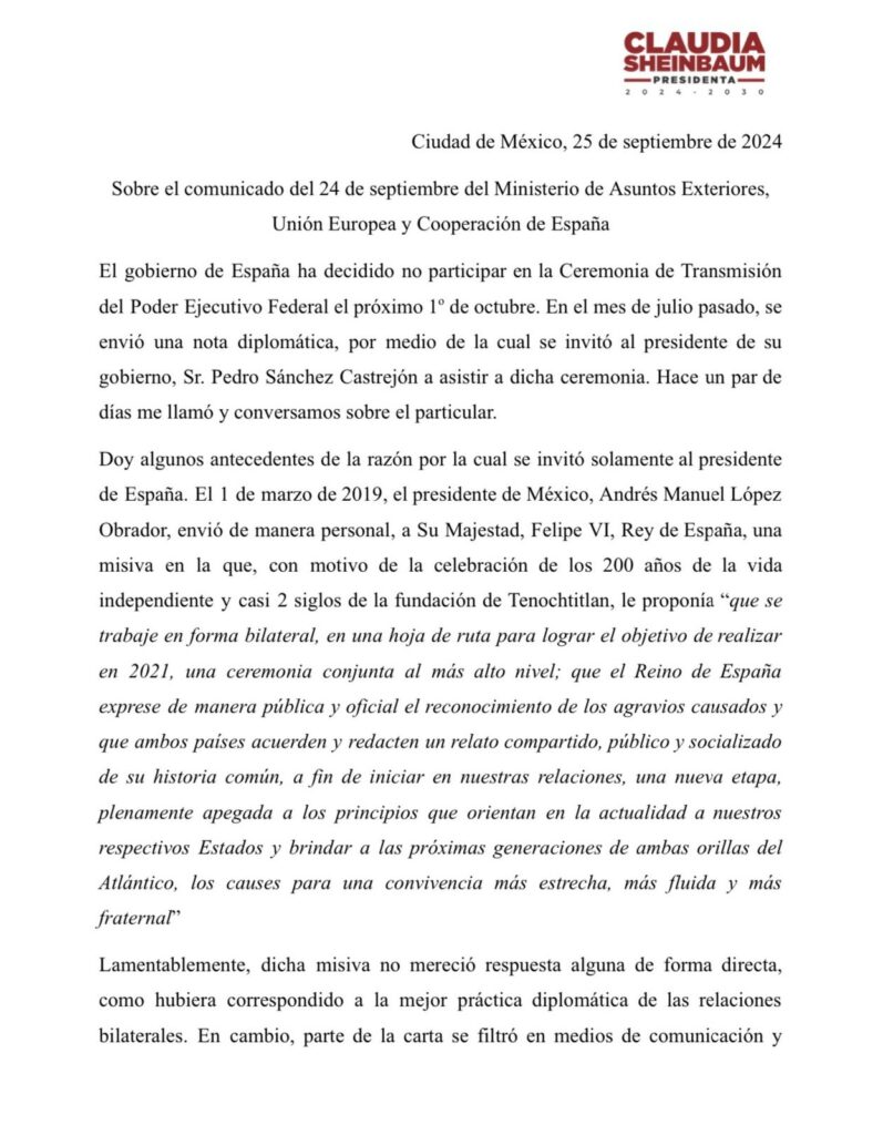 Redacción Xalapa.- A través de un comunicado, la presidenta electa de México, Claudia Sheinbaum Pardo confirmó que el Gobierno de España ha decidido no participar en la Ceremonia de Transmisión del Poder Ejecutivo del próximo 1 de octubre del 2024.
