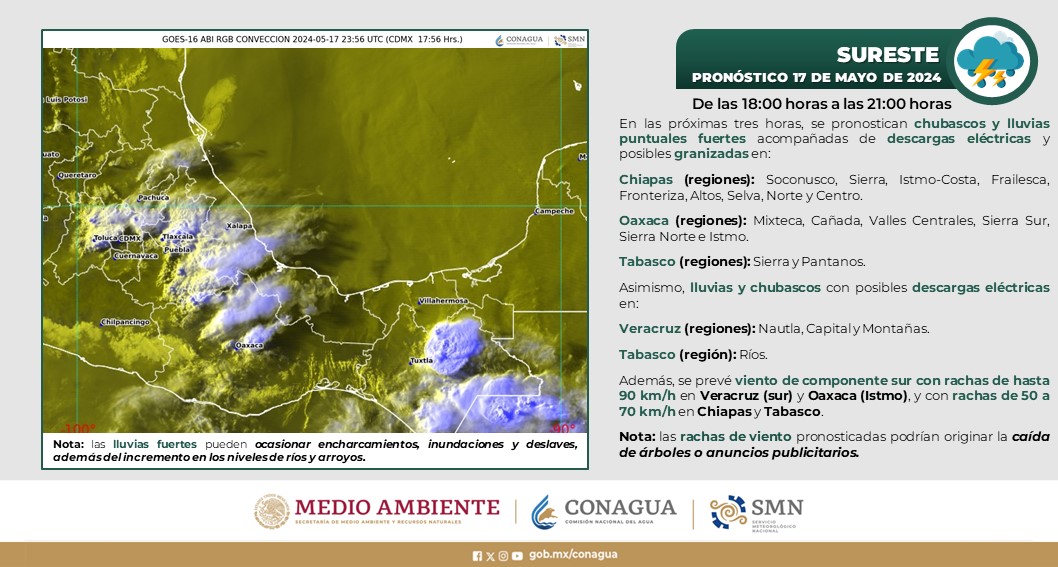 A partir de las próximas horas, concentraciones de masas de aire frío provocarán granizadas y chubascos en el sureste de México. Estados como Veracruz, Chiapas, Oaxaca y Tabasco, se verán afectados por estos efectos climáticos, así como lluvias fuertes y descargas eléctricas.