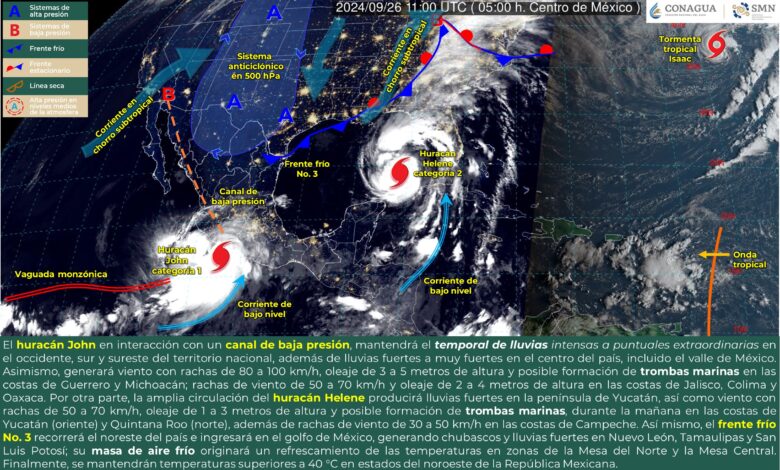 Por otra parte, el huracán Helene se desplazará hacia la península de Florida, EUA. Su amplia circulación producirá lluvias fuertes en la península de Yucatán, así como viento con rachas de 50 a 70 km/h, oleaje de 1 a 3 metros de altura y posible formación de trombas marinas, durante la mañana en las costas de Yucatán (oriente) y Quintana Roo (norte), además de rachas de viento de 30 a 50 km/h en las costas de Campeche.