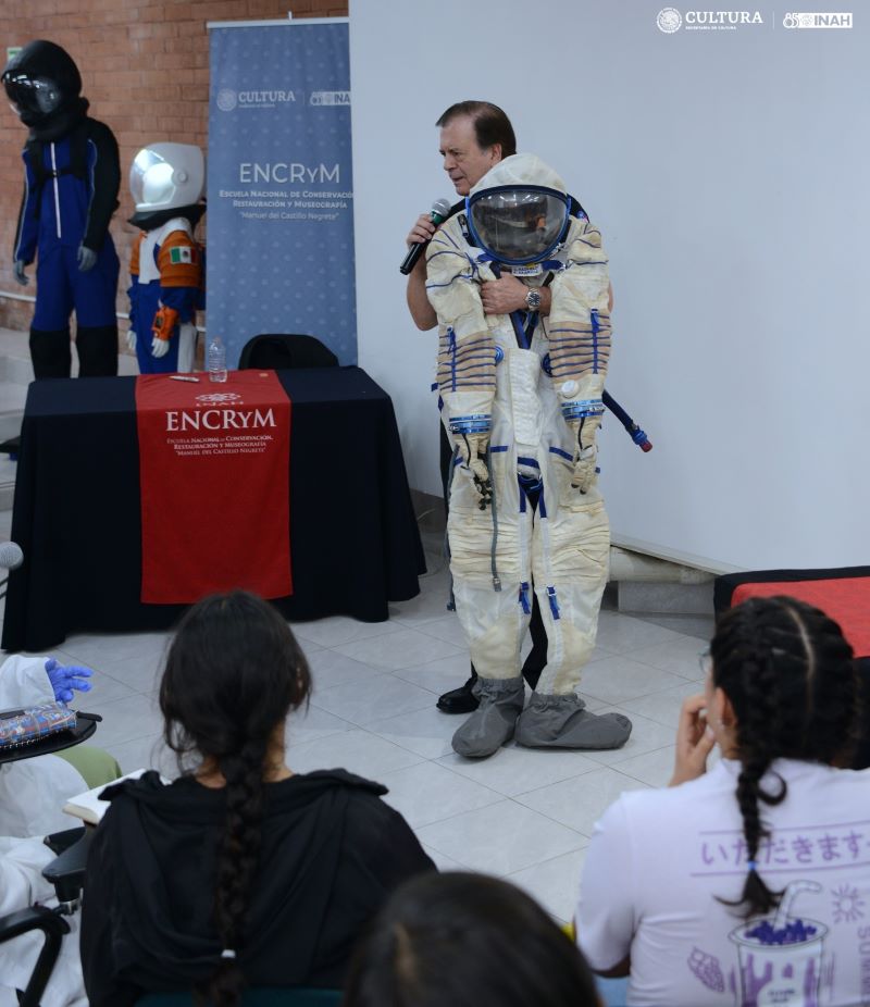 Rosa Lorena Román Torres, detalló «La conservación del traje espacial implica un reto por tratarse de materiales plásticos en objetos textiles: fibras sintéticas como el neopreno, spandex y nylon 6. Aquí abordaremos su tratamiento de agosto a diciembre de 2024, el cual iniciará con la investigación interdisciplinaria que realizarán seis estudiantes del tercer semestre de la carrera de Restauración, con asesoría de las y los especialistas que conforman el seminario taller: tres restauradoras, una historiadora, una bióloga, un químico y un ingeniero textil, cuya participación será crucial para el tratamiento».