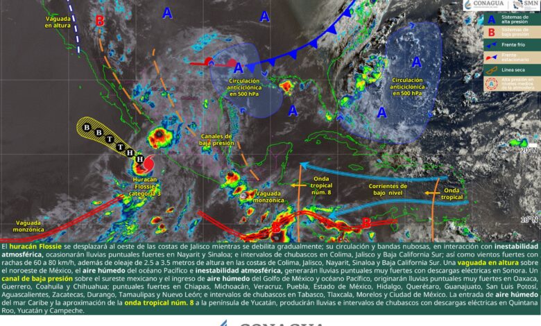 Para hoy, el huracán Flossie se desplazará al oeste de las costas de Jalisco mientras se debilita gradualmente; su circulación y bandas nubosas, en interacción con inestabilidad atmosférica, ocasionarán lluvias puntuales fuertes en zonas de Nayarit y Sinaloa; y lluvias con intervalos de chubascos en Colima, Jalisco y Baja California Sur; así como vientos fuertes con rachas de 60 a 80 km/h, además de oleaje de 2.5 a 3.5 metros de altura en las costas de Colima, Jalisco, Nayarit, Sinaloa y Baja California Sur. A su vez, una vaguada en altura sobre el noroeste de México, el aporte de aire húmedo del océano Pacífico, e inestabilidad atmosférica, generarán lluvias puntuales muy fuertes acompañadas con descargas eléctricas en zonas de Sonora. Un canal de baja presión sobre el sureste mexicano, y el ingreso de aire húmedo del Golfo de México y océano Pacífico, originarán lluvias puntuales muy fuertes en Oaxaca, Guerrero, Coahuila y Chihuahua; puntuales fuertes en Chiapas, Michoacán, Veracruz, Puebla, Estado de México, Hidalgo, Querétaro, Guanajuato, San Luis Potosí, Aguascalientes, Zacatecas, Durango, Tamaulipas y Nuevo León; e intervalos de chubascos en Tabasco, Tlaxcala, Morelos y Ciudad de México, acompañadas con descargas eléctricas. Por su parte, la entrada de aire húmedo del mar Caribe y la aproximación de la onda tropical núm. 8 a la península de Yucatán, producirán lluvias e intervalos de chubascos en Quintana Roo, Yucatán y Campeche, con descargas eléctricas. Finalmente, se mantendrá el ambiente caluroso a muy caluroso por la tarde sobre entidades del noroeste y norte de la República Mexicana, además de la península de Yucatán, y extremadamente caluroso con temperaturas máximas superiores a 45 °C en el noreste de Baja California.