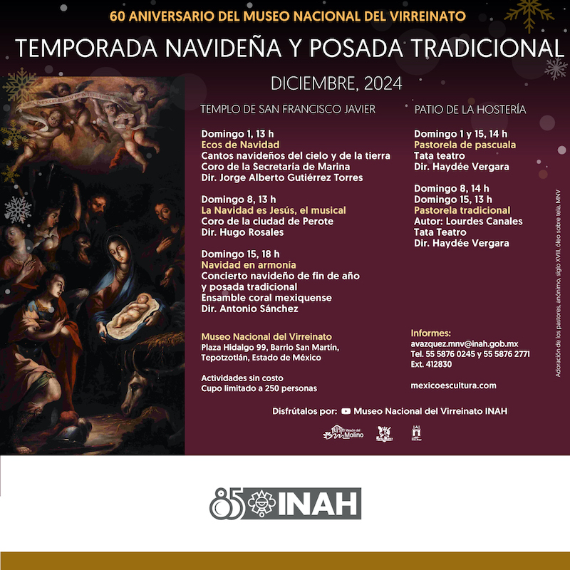 Redacción Xalapa.- El Instituto Nacional de Antropología e Historia (INAH), recordó que como ya es tradición desde hace 23 años, el Museo Nacional del Virreinato (MNV) del Estado de México (Edomex), llevará a cabo su temporada navideña y de posadas tradicionales, que incluye actividades como conciertos y pastorelas, los días 8 y 15 de diciembre de 2024.