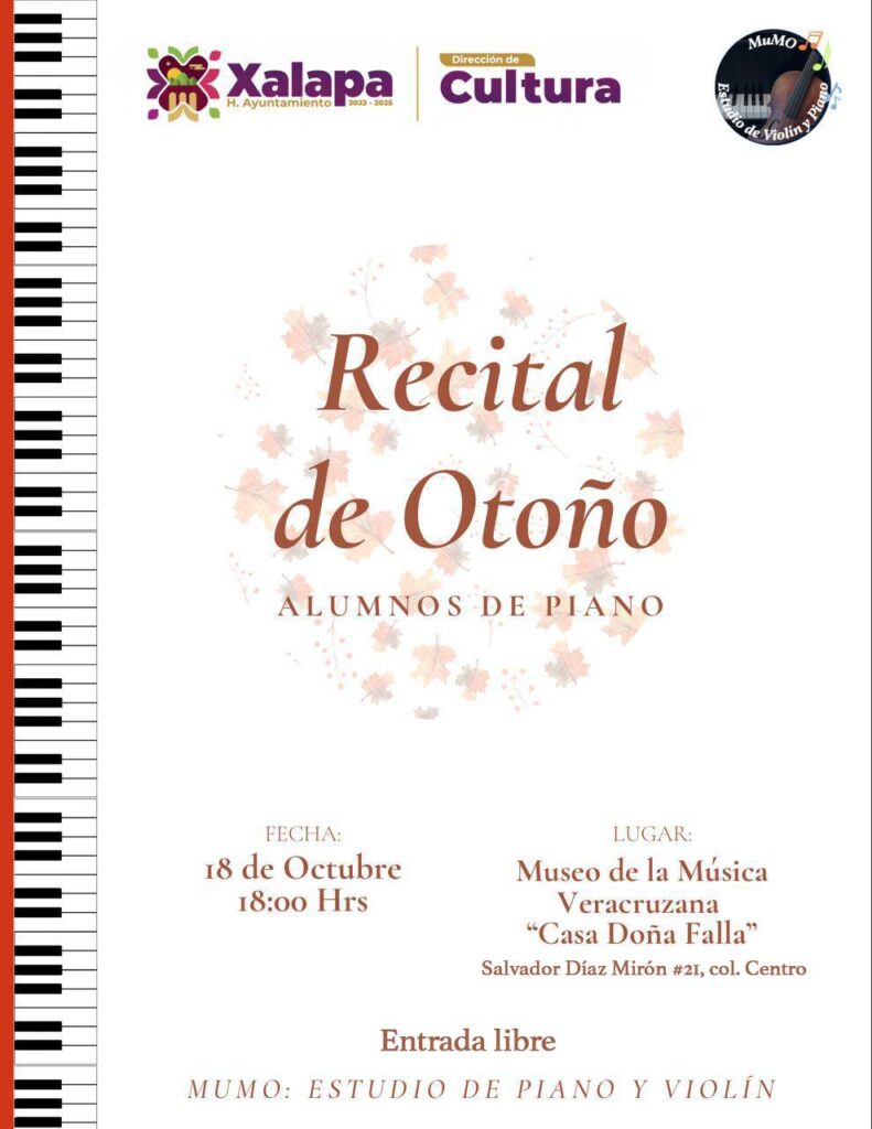 Además, los alumnos de la maestra Guadalupe Moreno, darán un recital de piano y violín este viernes 18 de octubre a las 18:00 horas, quienes presentarán el programa titulado “Concierto de Otoño”, donde mostrarán los conocimientos y habilidades adquiridas en estos meses.