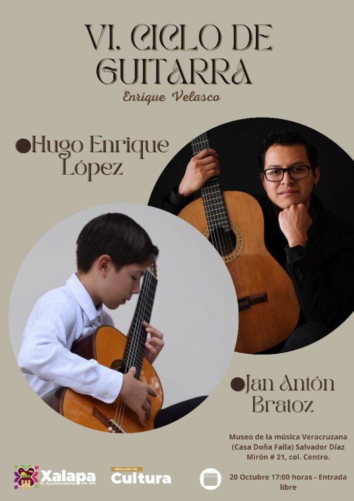 Finalmente, en el marco del VI Ciclo de Guitarra “Enrique Velasco”, este domingo 20 de octubre a las 17:00 horas, se ofrecerá un recital a cargo del joven Hugo Enrique López y el niño Jan Anton Bratoz, talentosos guitarristas con diversas participaciones en festivales y concursos nacionales e internacionales.