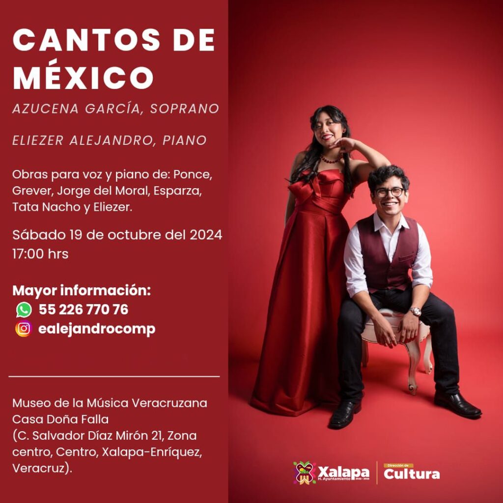 Con el programa Cantos de México, se presentarán la soprano Azucena García y el pianista y compositor Eliezer Alejandro, este sábado 19 de octubre a las 17:00 horas; se trata de alumnos destacados de la Escuela Superior de Música de Bellas Artes y la Facultad de Música de la UNAM.