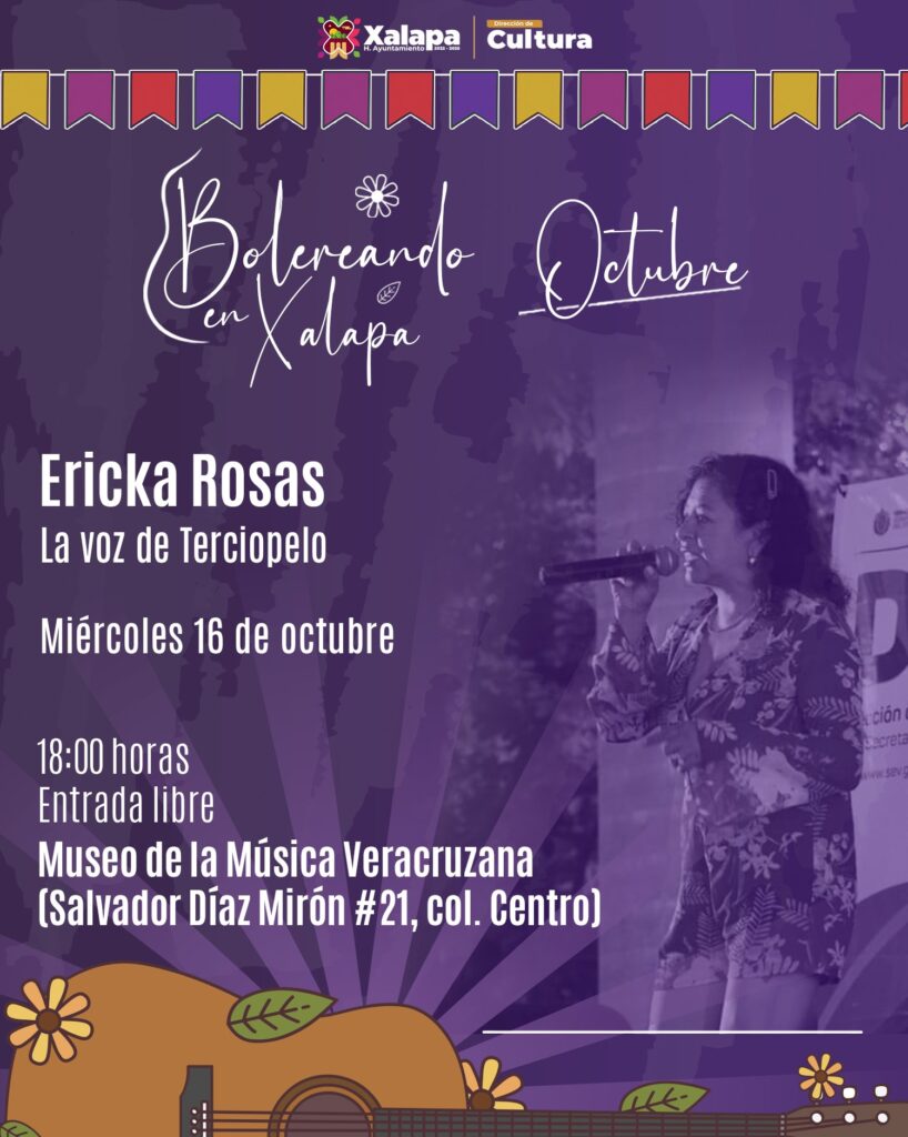 Ericka Rosas, cantante solista de la Dirección de Cultura del Ayuntamiento de Xalapa, se presentará este miércoles 16 de octubre a las 18:00 horas dentro del programa Bolereando en Xalapa.