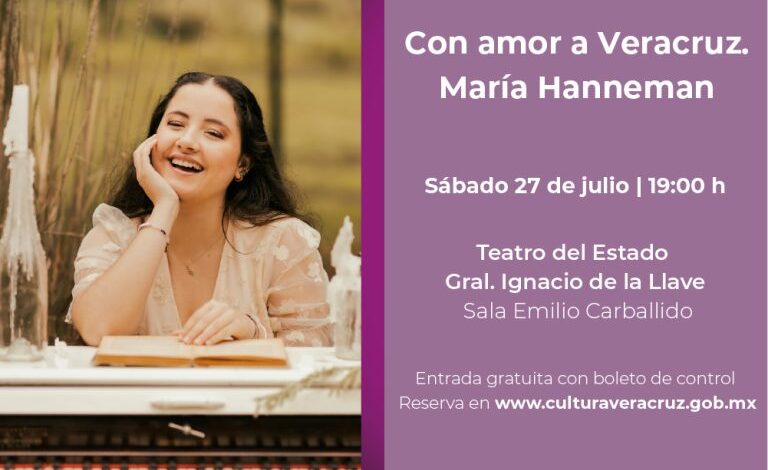 La Secretaría de Cultura de Veracruz, a través del Teatro del Estado General Ignacio de la Llave, invita al público al concierto Con amor a Veracruz, a cargo de la virtuosa pianista María Hanneman. El sábado 27 de julio del año en curso a las 19:00 horas en la Sala Emilio Carballido. La entrada es gratuita con boleto de control.