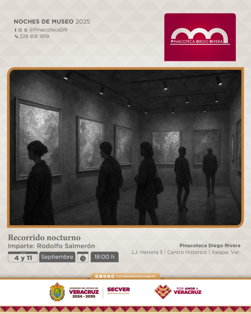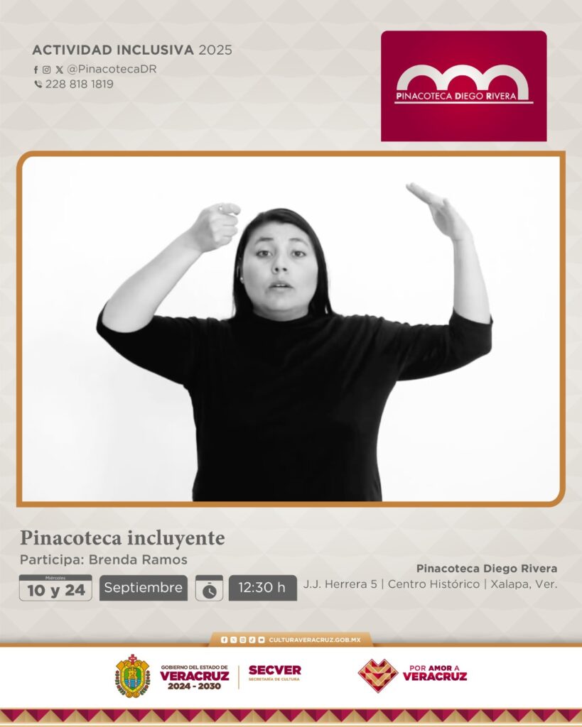 Xalapa, Ver., lunes 08 de septiembre de 2025.- La Secretaría de Cultura de Veracruz (SECVER) invita al público en general a visitar la Pinacoteca Diego Rivera y ser parte de las actividades gratuitas que el recinto tiene preparadas este mes para todas y todos los veracruzanos.