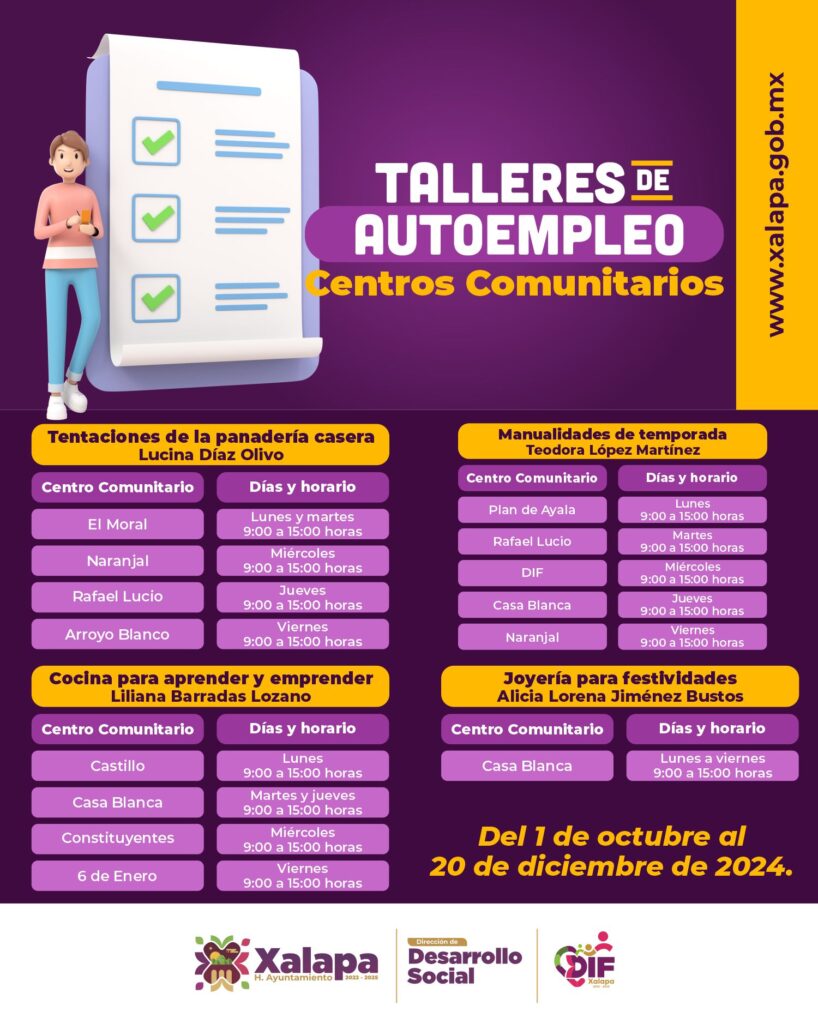 A través de la Dirección de Desarrollo Social y el DIF Municipal se presentará distintos talleres de autoempleo del 1 de octubre al 20 de diciembre. Las personas interesadas deberán acudir a su centro comunitario más cercano para solicitar los detalles e inscribirse.