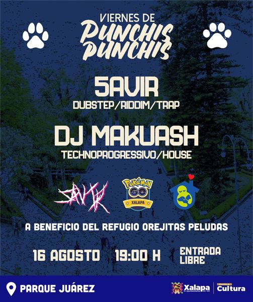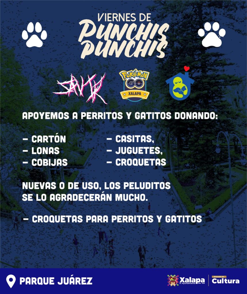 Este viernes 16 de agosto, a las 19:00 horas, se llevará a cabo el viernes de «Punchis, Punchis» para bailar al ritmo de la música. Además, en esta ocasión se contará la participación de la comunidad Pokémon Go Xalapa, los cuales estarán recolectando material, croquetas para perros y gatos del albergue «Orejitas Peludas Somos Su Voz- SOS Xalapa.