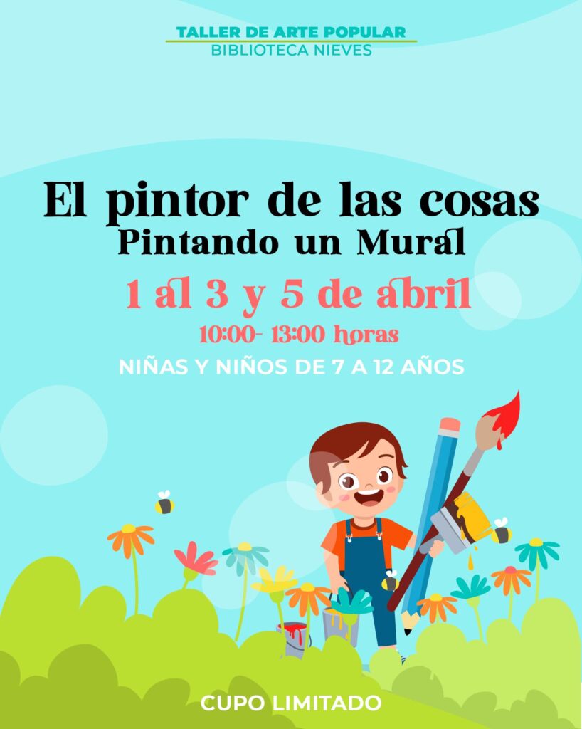 Finalmente, el Taller de Arte Popular en la Biblioteca Nieves de 10:00 a 13:00 horas, presenta «El pintor de las cosas», donde los niños de 7 a 12 años podrán pintar un mural.