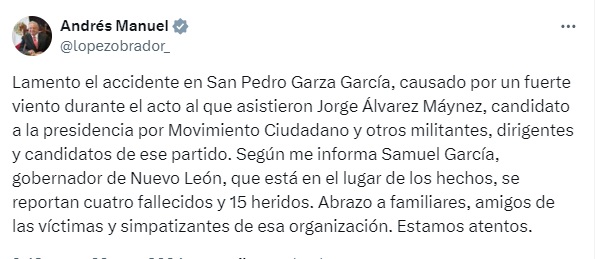 “Lamento el accidente en San Pedro Garza García, causado por un fuerte viento durante el acto al que asistieron Jorge Álvarez Máynez, candidato a la presidencia por Movimiento Ciudadano y otros militantes, dirigentes y candidatos de ese partido. Según me informa Samuel García, gobernador de Nuevo León, que está en el lugar de los hechos, se reportan cuatro fallecidos y 15 heridos. Abrazo a familiares, amigos de las víctimas y simpatizantes de esa organización. Estamos atentos”. Indicó en un mensaje en su cuenta de X.