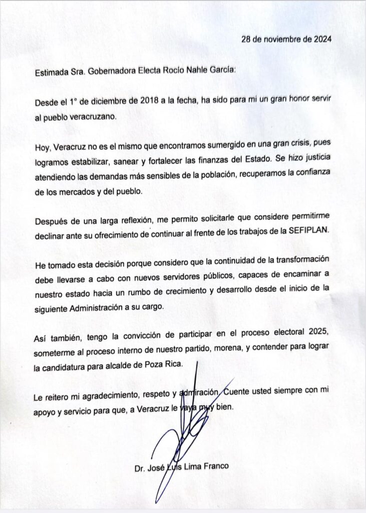 En ese sentido, Rocío Nahle fue cordial al escribir en sus redes sociales que «el compañero y amigo José Luis Lima tiene sus legítimas aspiraciones dentro de nuestro movimiento en Veracruz. En estos meses de transición nos apoyó incondicionalmente y le agradezco su disposición; los mejores deseos en la búsqueda de su nuevo proyecto.»