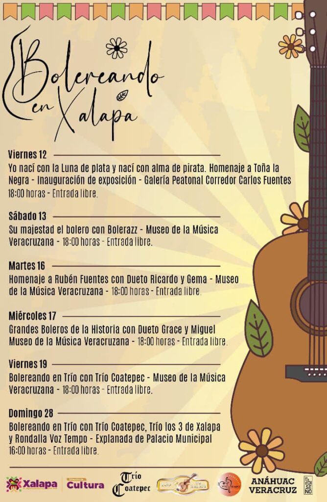 Ante ello, el alcalde de Xalapa Ricardo Ahued comunicó » Nos complace anunciar que este 12 de julio daremos inicio al programa «Bolereando en Xalapa». Las y los invitamos a disfrutar de este género musical considerado Patrimonio Cultural Inmaterial de la Humanidad».