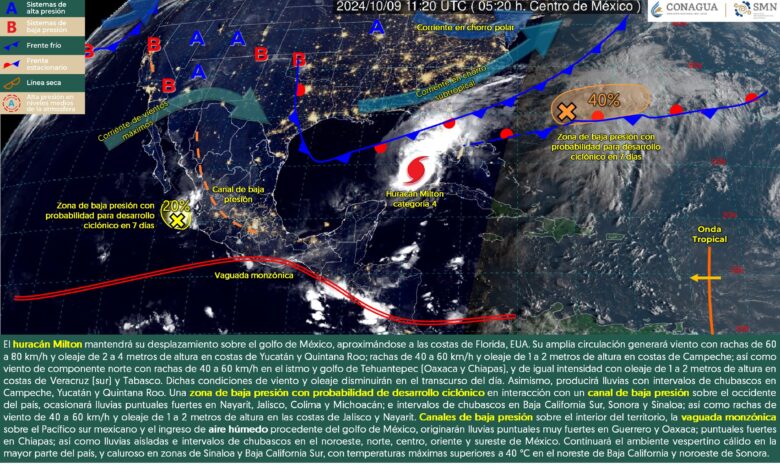 Para hoy, el huracán Milton mantendrá su desplazamiento sobre el golfo de México, aproximándose a las costas de Florida, EUA. Su amplia circulación generará viento con rachas de 60 a 80 km/h y oleaje de 2 a 4 metros de altura en costas de Yucatán y Quintana Roo; vientos de 40 a 60 km/h y oleaje de 1 a 2 metros de altura en costas de Campeche; así como viento de componente norte con rachas de 40 a 60 km/h en el istmo y golfo de Tehuantepec (Oaxaca y Chiapas), y de igual intensidad con oleaje de 1 a 2 metros de altura en costas de Veracruz (sur) y Tabasco. Dichas condiciones de viento y oleaje disminuirán en el transcurso del día. Asimismo, continuará favoreciendo el ingreso de aire húmedo del golfo de México a lo largo del litoral y hacia la península de Yucatán, lo que producirá lluvias con intervalos de chubascos en Yucatán y Quintana Roo. Por otro lado, una zona de baja presión con probabilidad de desarrollo ciclónico en el océano Pacífico, se localizará frente a las costas de Nayarit y Jalisco, en interacción con un canal de baja presión sobre el occidente del país, ocasionará lluvias puntuales fuertes en Nayarit, Jalisco, Colima y Michoacán; e intervalos de chubascos en Baja California Sur, Sonora y Sinaloa; así como rachas de viento de 40 a 60 km/h y oleaje de 1 a 2 metros de altura en las costas de Jalisco y Nayarit. A su vez, canales de baja presión sobre el interior del territorio, la vaguada monzónica sobre el Pacífico sur mexicano y el ingreso de aire húmedo procedente del golfo de México, originarán lluvias puntuales muy fuertes en Guerrero y Oaxaca; puntuales fuertes en Chiapas; así como lluvias aisladas e intervalos de chubascos en el noroeste, norte, centro y sureste de México. Finalmente, continuará el ambiente vespertino cálido en la mayor parte del país, y caluroso en zonas de Sinaloa y Baja California Sur, con temperaturas máximas superiores a 40 °C en el noreste de Baja California y noroeste de Sonora.
