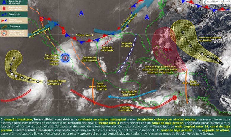 Este día, el monzón mexicano, inestabilidad atmosférica, la corriente en chorro subtropical y una circulación ciclónica en niveles medios, generará lluvias muy fuertes a puntuales intensas en el noroeste del territorio nacional. Así mismo, el frente núm. 4 se extenderá con características de estacionario sobre el norte y noreste del país; interaccionará con un canal de baja presión y originará lluvias fuertes a muy fuertes en las regiones mencionadas. A su vez, se prevé un descenso de la temperatura en Coahuila, Nuevo León y Tamaulipas. Por otra parte, la onda tropical núm. 34 se desplazará sobre el sur del país, en combinación con un canal de baja presión sobre el interior de la República Mexicana, y con inestabilidad atmosférica, originará lluvias muy fuertes en el centro y sur del territorio nacional. A su vez, un canal de baja presión sobre el oriente y sureste del país, aunado a una vaguada en altura sobre la península de Yucatán, generarán chubascos y lluvias fuertes en las regiones mencionadas, así como lluvias puntuales muy fuertes en zonas de Puebla, Veracruz y Oaxaca. Finalmente, continuará el ambiente cálido a caluroso en la mayor parte del territorio nacional, con temperaturas superiores a los 40 °C en Baja California (noreste) y Sonora (oeste).