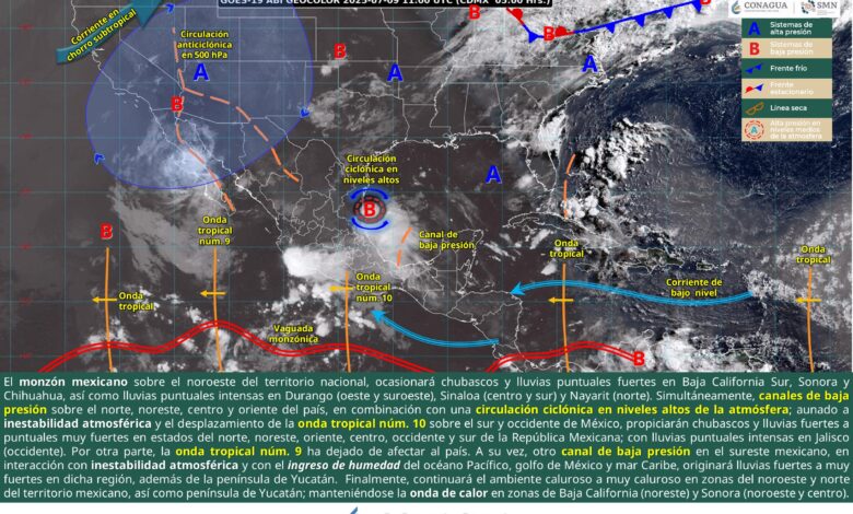 Este día, el monzón mexicano sobre el noroeste del territorio nacional, ocasionará chubascos y lluvias puntuales fuertes en Baja California Sur, Sonora y Chihuahua, así como lluvias puntuales intensas en Durango (oeste y suroeste), Sinaloa (centro y sur) y Nayarit (norte). Simultáneamente, canales de baja presión sobre el norte, noreste, centro y oriente del país, en combinación con una circulación ciclónica en niveles altos de la atmósfera; aunado a inestabilidad atmosférica y el desplazamiento de la onda tropical núm. 10 sobre el sur y occidente de México, propiciarán chubascos y lluvias fuertes a puntuales muy fuertes en estados del norte, noreste, oriente, centro, occidente y sur de la República Mexicana; con lluvias puntuales intensas en Jalisco (occidente). Por otra parte, la onda tropical núm. 9 ha dejado de afectar al país. A su vez, otro canal de baja presión en el sureste mexicano, en interacción con inestabilidad atmosférica y con el ingreso de humedad del océano Pacífico, golfo de México y mar Caribe, originará lluvias fuertes a muy fuertes en dicha región, además de la península de Yucatán. Finalmente, continuará el ambiente caluroso a muy caluroso en zonas del noroeste y norte del territorio mexicano, así como península de Yucatán; manteniéndose la onda de calor en zonas de Baja California (noreste) y Sonora (noroeste y centro).