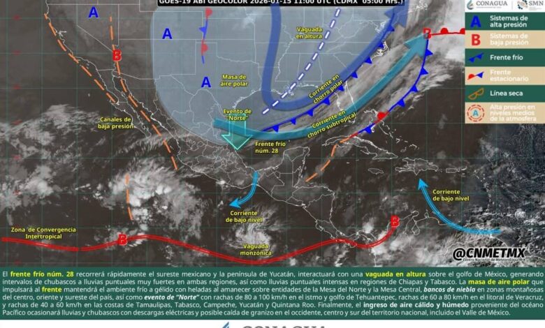 Este día, el frente frío núm. 28 recorrerá rápidamente el sureste mexicano y la península de Yucatán, interactuará con una vaguada en altura sobre el golfo de México, generando intervalos de chubascos a lluvias puntuales muy fuertes en ambas regiones, así como lluvias puntuales intensas en regiones de Chiapas y Tabasco. La masa de aire polar que impulsará al frente mantendrá el ambiente frío a gélido con heladas al amanecer sobre entidades de la Mesa del Norte y la Mesa Central, bancos de niebla en zonas montañosas del centro, oriente y sureste del país, así como evento de “Norte” con rachas de 80 a 100 km/h en el istmo y golfo de Tehuantepec, rachas de 60 a 80 km/h en el litoral de Veracruz, y rachas de 40 a 60 km/h en las costas de Tamaulipas, Tabasco, Campeche, Yucatán y Quintana Roo. Finalmente, el ingreso de aire cálido y húmedo proveniente del océano Pacífico ocasionará lluvias y chubascos con descargas eléctricas y posible caída de granizo en el occidente, centro y sur del territorio nacional, incluido el Valle de México.