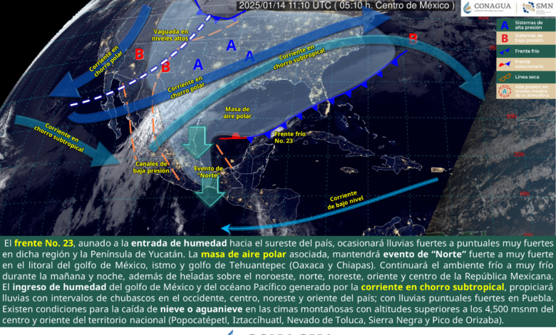 Durante este día, el frente No. 23 se extenderá con características de estacionario desde el norte de la península de Yucatán hasta el sur del golfo de México; aunado a la entrada de humedad hacia el sureste del país, generando condiciones para lluvias fuertes a puntuales muy fuertes en dichas regiones. Simultáneamente, la masa de aire polar asociada, mantendrá evento de “Norte” fuerte a muy fuerte en el litoral del golfo de México, istmo y golfo de Tehuantepec (Oaxaca y Chiapas). Asimismo, continuará el ambiente frío a muy frío durante la mañana y noche, además de heladas sobre el noroeste, norte, noreste, oriente y centro de la República Mexicana. Por otra parte, el ingreso de humedad del golfo de México y del océano Pacífico generado por la corriente en chorro subtropical, propiciará lluvias con intervalos de chubascos en el occidente, centro, noreste y oriente del país; con lluvias puntuales fuertes en Puebla. Finalmente, existen condiciones para la caída de nieve o aguanieve en las cimas montañosas con altitudes superiores a los 4,500 msnm del centro y oriente del territorio nacional (Popocatépetl, Iztaccíhuatl, Nevado de Toluca, Sierra Negra y Pico de Orizaba).