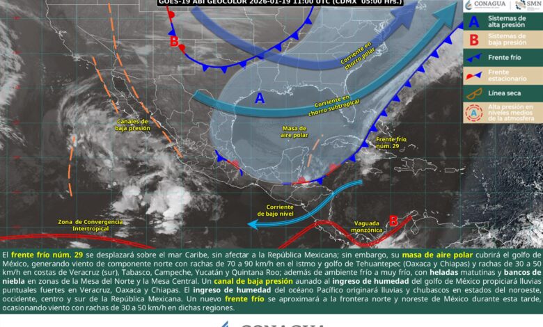 Este día, el frente frío núm. 29 se desplazará sobre el mar Caribe, sin afectar a la República Mexicana, sin embargo, su masa de aire polar cubrirá el golfo de México, generando viento de componente norte con rachas de 70 a 90 km/h en el istmo y golfo de Tehuantepec (Oaxaca y Chiapas) y rachas de 30 a 50 km/h en costas de Veracruz (sur), Tabasco, Campeche, Yucatán y Quintana Roo; además de ambiente frío a muy frío, con heladas matutinas y bancos de niebla en zonas de la Mesa del Norte y la Mesa Central. Por otra parte, un canal de baja presión en el sureste mexicano, aunado al ingreso de humedad del golfo de México propiciará lluvias puntuales fuertes en Veracruz, Oaxaca y Chiapas. A su vez, el ingreso de humedad del océano Pacífico originará lluvias y chubascos en estados del noroeste, occidente, centro y sur de la República Mexicana. Finalmente, un nuevo frente frío se aproximará a la frontera norte y noreste de México durante esta tarde, ocasionando viento con rachas de 30 a 50 km/h en dichas regiones.