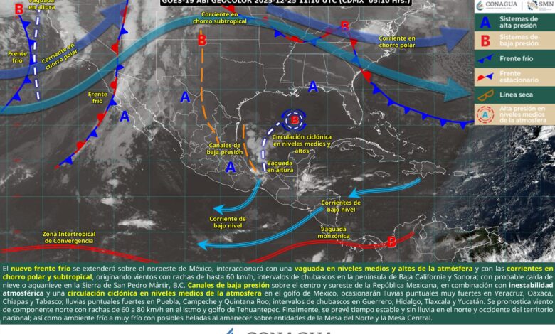 Hoy, el nuevo frente frío se extenderá sobre el noroeste de México, interaccionará con una vaguada en niveles medios y altos de la atmósfera y con las corrientes en chorro polar y subtropical, originando vientos con rachas de hasta 60 km/h, intervalos de chubascos en la península de Baja California y Sonora; con probable caída de nieve o aguanieve en la Sierra de San Pedro Mártir, B.C. Canales de baja presión sobre el centro y sureste de la República Mexicana, en combinación con inestabilidad atmosférica y una circulación ciclónica en niveles medios de la atmosfera en el golfo de México, ocasionarán lluvias puntuales muy fuertes en Veracruz (Papaloapan, Los Tuxtlas y Olmeca), Oaxaca, Chiapas y Tabasco; lluvias puntuales fuertes en Puebla (Valle Serdán y Tehuacán-Sierra Negra), Veracruz (Sotavento y Las Montañas), Campeche y Quintana Roo; intervalos de chubascos en Guerrero, Hidalgo, Tlaxcala, Puebla (Sierra Norte y Sierra Nororiental), Veracruz (Huasteca Baja, Totonaca, Nautla y Capital) y Yucatán. Se pronostica viento de componente norte con rachas de 60 a 80 km/h en el istmo y golfo de Tehuantepec (Oaxaca y Chiapas). Finalmente, se prevé tiempo estable y sin lluvia en el norte y occidente del territorio nacional; así como ambiente frío a muy frío con posibles heladas al amanecer sobre entidades de la Mesa del Norte y la Mesa Central.