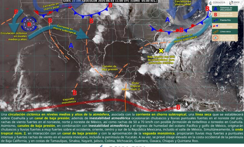 Durante este día, una circulación ciclónica en niveles medios y altos de la atmósfera, asociada con la corriente en chorro subtropical, una línea seca que se establecerá sobre Coahuila, y un canal de baja presión; además de inestabilidad atmosférica ocasionarán chubascos y lluvias puntuales fuertes en el noreste del país, rachas de viento fuertes en el noroeste, norte y noreste de México, así como rachas de 50 a 70 km/h con posible formación de torbellinos o tornados en Coahuila. Asimismo, canales de baja presión, en combinación con inestabilidad atmosférica y el ingreso de humedad del océano Pacífico y golfo de México, originarán chubascos y lluvias fuertes a muy fuertes sobre el occidente, oriente, centro y sur de la República Mexicana, incluido el valle de México. Simultáneamente, la onda tropical núm. 2, en interacción con un canal de baja presión y con la aproximación de la vaguada monzónica, propiciarán lluvias muy fuertes a puntuales intensas y fuertes rachas de viento en el sureste mexicano, incluida la península de Yucatán. A su vez, se prevé oleaje elevado en la costa occidental de la península de Baja California, y en costas de Tamaulipas, Sinaloa, Nayarit, Jalisco, Colima, Michoacán, Guerrero, Oaxaca, Chiapas y Quintana Roo. Por otra parte, se mantendrá el ambiente caluroso a muy caluroso sobre gran parte del territorio nacional, prevaleciendo la onda de calor en los estados de Chihuahua (sur y sureste), Coahuila (oeste y suroeste), Nuevo León (sur), Tamaulipas (sur y suroeste), Durango, Zacatecas, San Luis Potosí, Aguascalientes, Sinaloa, Nayarit, Jalisco (sur y oeste), Colima, Michoacán (oeste, centro y sureste), Guerrero (oeste y norte) y Oaxaca (centro y sur). Finalmente, debido a la persistencia de nubosidad y lluvias sobre la península de Yucatán, se prevé que, a partir de este día, finalice la onda de calor en la península de Yucatán.