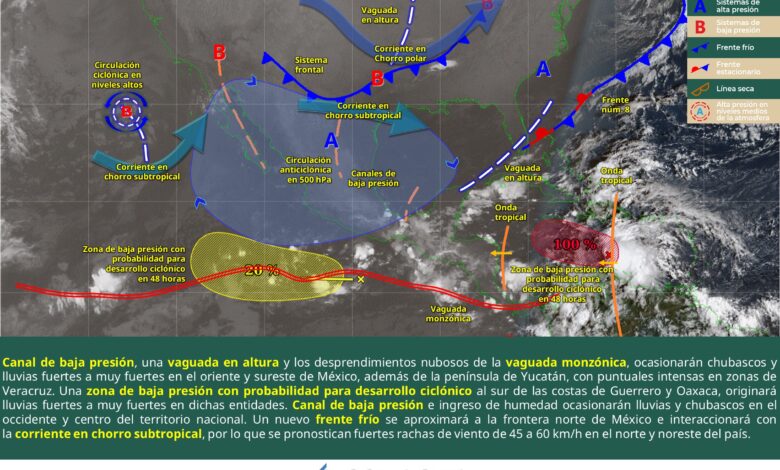 Este día, un canal de baja presión extendido sobre el oriente y sureste de la República Mexicana, una vaguada en altura sobre la península de Yucatán y los desprendimientos nubosos de la vaguada monzónica hacia las costas del Pacífico Sur mexicano, ocasionarán chubascos y lluvias fuertes a muy fuertes en las regiones mencionadas, con puntuales intensas en zonas de Veracruz y Oaxaca. Una zona de baja presión con probabilidad para desarrollo ciclónico al sur de las costas de Guerrero, reforzará la probabilidad de lluvias fuertes en el sur del país. Otro canal de baja presión se extenderá sobre el occidente y centro del territorio nacional, y, en combinación con el ingreso de humedad del océano Pacífico y golfo de México, ocasionarán lluvias y chubascos en dichas regiones. Un nuevo frente frío se aproximará a la frontera norte de México e interaccionará con la corriente en chorro subtropical, por lo que se pronostican fuertes rachas de viento de 45 a 60 km/h en el norte y noreste del país. Por su parte, una vaguada en niveles medios y altos de la atmósfera ingresará al noroeste del país, en donde ocasionará vientos con rachas de hasta 50 km/h, así como descenso de temperaturas en Baja California. Finalmente, una circulación anticiclónica en niveles medios de la atmósfera sobre la Mesa del Norte, ocasionará una baja probabilidad de lluvias en dicha región, además de la Mesa Central y el noreste del país.