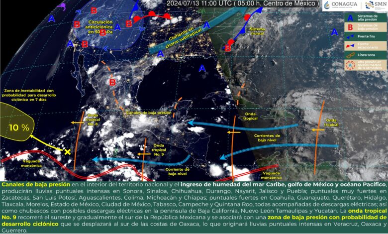 Para hoy, canales de baja presión en el interior del territorio nacional y el ingreso de humedad del mar Caribe, golfo de México y océano Pacífico, producirán lluvias puntuales intensas en Sonora, Sinaloa, Chihuahua, Durango, Nayarit, Jalisco y Puebla; puntuales muy fuertes en Zacatecas, San Luis Potosí, Aguascalientes, Colima, Michoacán y Chiapas; puntuales fuertes en Coahuila, Guanajuato, Querétaro, Hidalgo, Tlaxcala, Morelos, Estado de México, Ciudad de México, Tabasco, Campeche y Quintana Roo, todas acompañadas de descargas eléctricas; así como chubascos con posibles descargas eléctricas en la península de Baja California, Nuevo León Tamaulipas y Yucatán. La onda tropical No. 9 recorrerá el sureste y gradualmente el sur de la República Mexicana y se asociará con una zona de baja presión con probabilidad de desarrollo ciclónico que se desplazará al sur de las costas de Oaxaca, lo que originará lluvias puntuales intensas en Veracruz, Oaxaca y Guerrero. Finalmente, continuará el ambiente cálido a caluroso por la tarde sobre entidades del norte y noreste del territorio nacional, estados del litoral del Pacífico mexicano y del golfo de México, incluida la península de Yucatán, con temperaturas máximas muy calurosas, superiores a 40 °C en zonas de Baja California y Baja California Sur.