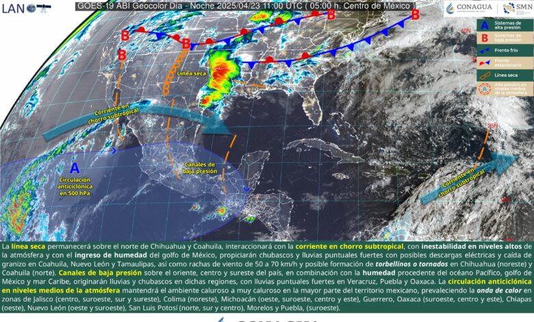 Para hoy, la línea seca permanecerá sobre el norte de Chihuahua y Coahuila, interaccionará con la corriente en chorro subtropical, con inestabilidad en niveles altos de la atmósfera y con el ingreso de humedad del golfo de México, propiciarán chubascos y lluvias puntuales fuertes con posibles descargas eléctricas y caída de granizo en Coahuila, Nuevo León y Tamaulipas, así como rachas de viento de 50 a 70 km/h y posible formación de torbellinos o tornados en Chihuahua (noreste) y Coahuila (norte). Por otra parte, canales de baja presión sobre el oriente, centro y sureste del país, en combinación con la humedad procedente del océano Pacífico, golfo de México y mar Caribe, originarán lluvias y chubascos en dichas regiones, con lluvias puntuales fuertes en Veracruz, Puebla y Oaxaca. La circulación anticiclónica en niveles medios de la atmósfera mantendrá el ambiente caluroso a muy caluroso en la mayor parte del territorio mexicano, prevaleciendo la onda de calor en zonas de Jalisco (centro, suroeste, sur y sureste), Colima (noreste), Michoacán (oeste, suroeste, centro y este), Guerrero, Oaxaca (suroeste, centro y este), Chiapas (oeste), Nuevo León (oeste y suroeste), San Luis Potosí (norte, sur y centro), Morelos y Puebla, (suroeste).