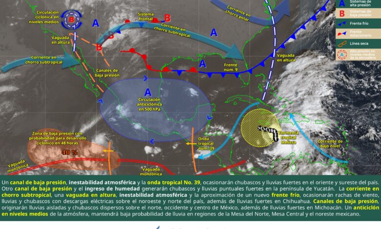 Este día, un canal de baja presión sobre el oriente y sureste del país, inestabilidad atmosférica y la onda tropical No. 39 al sur de Chiapas, ocasionarán chubascos y lluvias fuertes en dichas regiones. A su vez, otro canal de baja presión y el ingreso de humedad procedente del mar Caribe y golfo de México generarán chubascos y lluvias puntuales fuertes en la península de Yucatán.  Por otra parte, la corriente en chorro subtropical y una vaguada en altura sobre el noroeste y norte del país, en interacción con inestabilidad atmosférica y la aproximación de un nuevo frente frío a la frontera norte de México, ocasionarán rachas de viento, lluvias y chubascos con descargas eléctricas en las regiones mencionadas, además de lluvias puntuales fuertes en Chihuahua. Así mismo, canales de baja presión sobre el interior del país, originarán lluvias aisladas y chubascos dispersos en estados del norte, occidente y centro de México, además de lluvias puntuales fuertes en Michoacán. Un anticiclón en niveles medios de la atmósfera sobre la mayor parte del territorio nacional, mantendrá baja probabilidad de lluvia en regiones de la Mesa del Norte, Mesa Central y el noreste mexicano.