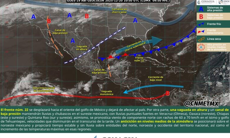 El frente núm. 22 se desplazará hacia el oriente del golfo de México y dejará de afectar al país.