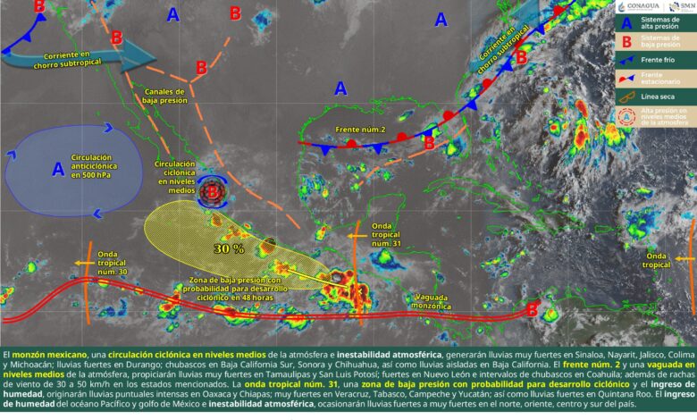 Este día, el monzón mexicano, en combinación con una circulación ciclónica en niveles medios de la atmósfera sobre el occidente del país y con inestabilidad atmosférica, generarán lluvias muy fuertes en Sinaloa, Nayarit, Jalisco, Colima y Michoacán; lluvias fuertes en Durango; chubascos en Baja California Sur, Sonora y Chihuahua, así como lluvias aisladas en Baja California. Por otra parte, el frente núm. 2 prevalecerá con características de estacionario sobre el noreste de México, en interacción con una vaguada en niveles medios de la atmósfera, propiciarán lluvias muy fuertes en Tamaulipas y San Luis Potosí; lluvias fuertes en Nuevo León e intervalos de chubascos en Coahuila; así como rachas de viento de 30 a 50 km/h en los estados mencionados. Simultáneamente, la onda tropical núm. 31 se desplazará sobre el sureste mexicano, asociada con una zona de baja presión con probabilidad para desarrollo ciclónico al sur del golfo de Tehuantepec y, en interacción con el ingreso de humedad del golfo de México y mar Caribe, originarán lluvias puntuales intensas en Oaxaca y Chiapas; muy fuertes en Veracruz, Tabasco, Campeche y Yucatán; así como lluvias fuertes en Quintana Roo. Asimismo, el ingreso de humedad del océano Pacífico y golfo de México e inestabilidad atmosférica, ocasionarán lluvias fuertes a muy fuertes en el norte, oriente, centro y sur del territorio nacional. Finalmente, continuará el ambiente caluroso a muy caluroso en estados del norte de la República Mexicana, entidades del litoral del Pacífico y del golfo de México, además de la península de Yucatán; con temperaturas que podrían superar los 40 °C en zonas de Baja California y Sonora.