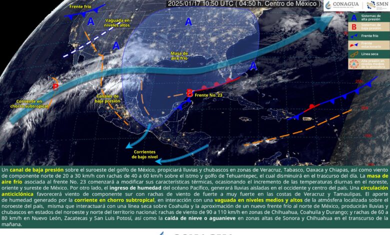 Este viernes, un canal de baja presión sobre el suroeste del golfo de México, propiciará lluvias y chubascos en zonas de Veracruz, Tabasco, Oaxaca y Chiapas, así como viento de componente norte de 20 a 30 km/h con rachas de 40 a 60 km/h sobre el istmo y golfo de Tehuantepec, el cual disminuirá en el trascurso del día. La masa de aire frío asociada al frente No. 23 comenzará a modificar sus características térmicas, ocasionando el incremento de las temperaturas diurnas en el noreste, oriente y sureste de México. Por otro lado, el ingreso de humedad del océano Pacífico, generará lluvias aisladas en el occidente y centro del país. Una circulación anticiclónica favorecerá viento de componente sur con rachas de viento de fuerte a muy fuerte en las costas de Veracruz y Tamaulipas. El aporte de humedad generado por la corriente en chorro subtropical, en interacción con una vaguada en niveles medios y altos de la atmósfera localizada sobre el noroeste del país, misma que interactuará con una línea seca sobre Coahuila y la aproximación de un nuevo frente frío al norte de México, producirán lluvias y chubascos en estados del noroeste y norte del territorio nacional; rachas de viento de 90 a 110 km/h en zonas de Chihuahua, Coahuila y Durango; y rachas de 60 a 80 km/h en Nuevo León, Zacatecas y San Luis Potosí, así como la caída de nieve o aguanieve en zonas altas de Sonora y Chihuahua en el transcurso de la mañana.