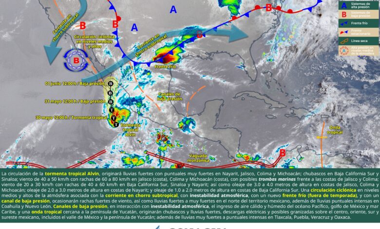 Durante este día, la tormenta tropical Alvin del océano Pacífico se desplazará al suroeste de las costas de Colima y Jalisco, su circulación propiciará desprendimientos nubosos hacia el occidente del país y Baja California Sur, originando lluvias fuertes con puntuales muy fuertes en Nayarit, Jalisco, Colima y Michoacán; chubascos en Baja California Sur y Sinaloa; viento de 40 a 50 km/h con rachas de 60 a 80 km/h en Jalisco (costa), Colima y Michoacán (costa), existen condiciones para la formación de trombas marinas frente a las costas de Jalisco y Colima; viento de 20 a 30 km/h con rachas de 40 a 60 km/h en Baja California Sur, Sinaloa y Nayarit; así como oleaje de 3.0 a 4.0 metros de altura, aumentando a 5.0 metros de altura en costas de Jalisco, Colima y Michoacán; oleaje de 2.0 a 3.0 metros de altura, aumentando a 4.0 metros de altura en costas de Nayarit; y oleaje de 1.0 a 2.0 metros de altura, aumentando a 3.0 metros de altura en las costas de Baja California Sur. Una circulación ciclónica en niveles medios y altos de la atmósfera asociada con la corriente en chorro subtropical sobre el noroeste del país, en interacción con inestabilidad atmosférica, con un nuevo frente frío (fuera de temporada) que se extenderá sobre la frontera norte del país, y con un canal de baja presión sobre la Mesa del Norte, ocasionarán rachas fuertes de viento, así como lluvias fuertes a muy fuertes en el norte del territorio mexicano, además de lluvias puntuales intensas en Coahuila y Nuevo León. Asimismo, canales de baja presión, en interacción con inestabilidad atmosférica, el ingreso de aire cálido y húmedo del océano Pacífico, golfo de México y mar Caribe, y una onda tropical que se aproximará a la península de Yucatán, originarán chubascos y lluvias fuertes acompañadas con descargas eléctricas y posibles granizadas sobre el centro, oriente, sur y sureste mexicano, incluidos el Valle de México y la península de Yucatán, además de lluvias muy fuertes a puntuales intensas en Tlaxcala, Puebla, Veracruz y Oaxaca. Finalmente, continuará el ambiente caluroso a muy caluroso sobre gran parte de la República Mexicana, prevaleciendo la onda de calor en zonas de Campeche, Yucatán y Quintana Roo.