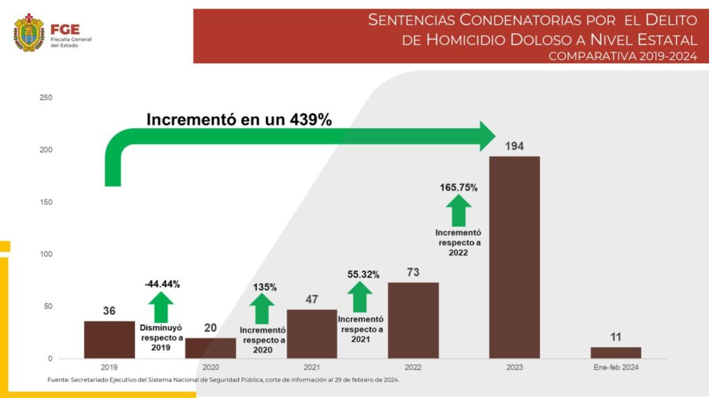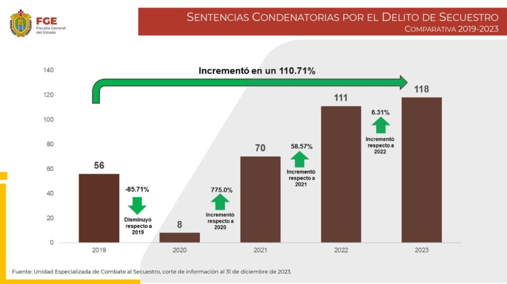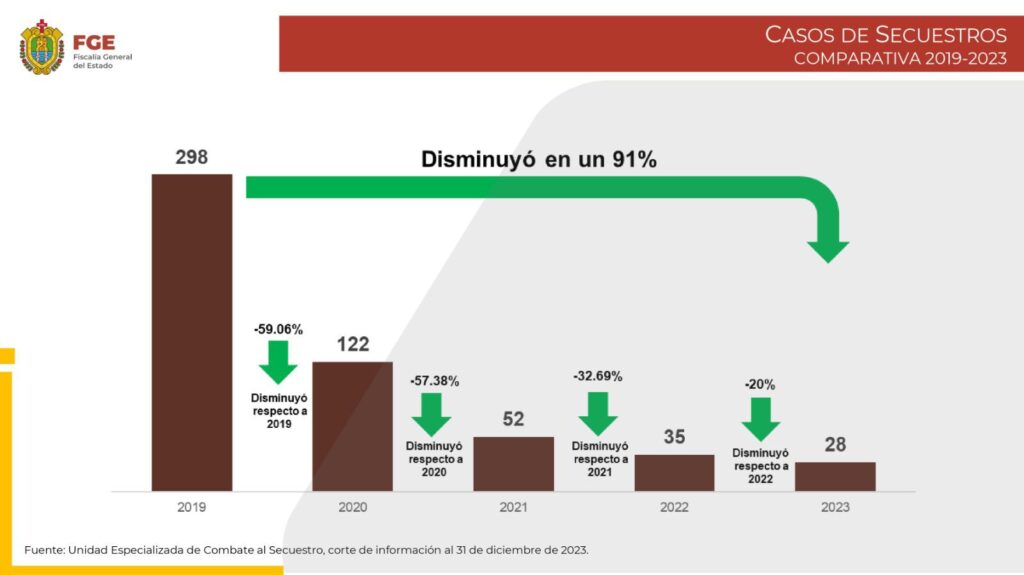 En 2017, este delito alcanzaba cifras superiores a los 2 mil casos al año, pero a partir de 2019, se ha reducido a más de la mitad. Destacó la coordinación entre la Fiscalía General del Estado y el Poder Judicial para trabajar con cero impunidad.