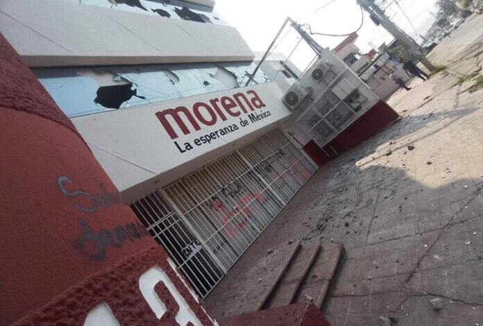 ⇒ Si bien todas fueron vandalizadas, las únicas oficinas que ardieron en llamas fueron las de Movimiento Ciudadano. Además, la propaganda electoral quedó tirada afuera de las oficinas.