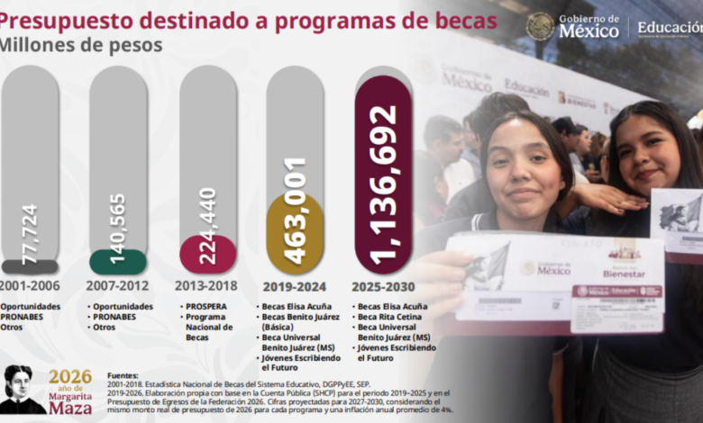 La presidenta Claudia Sheinbaum Pardo afirmó que el Gobierno de México tiene la responsabilidad de hacer de la educación pública la mejor de las educaciones; por ello, a 2030 se proyecta que se realizará una inversión histórica de un billón 136 mil 692 millones de pesos (mdp) en Becas para el Bienestar, en beneficio de estudiantes de primaria a universidad.