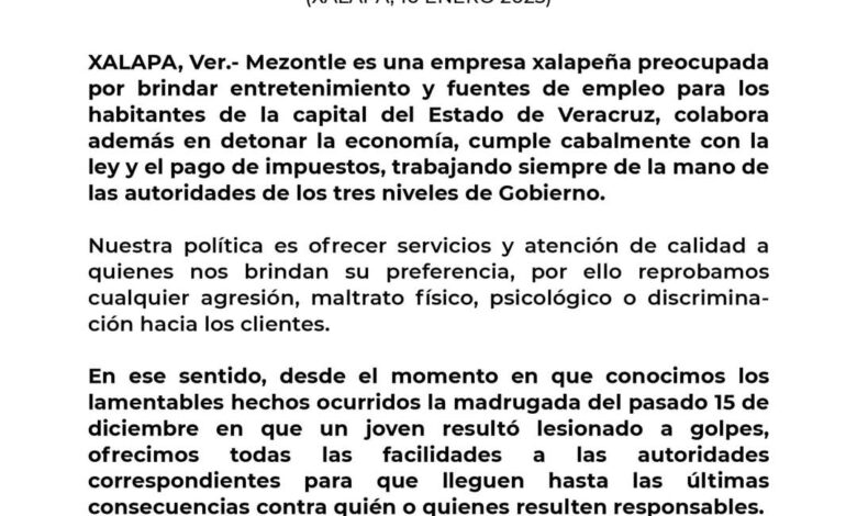 Redacción/Xalapa. Luego de que el 15 fe diciembre un joven resultara con lesiones tras ser agredido físicamente por miembros del cuerpo de seguridad de Mezontle, sucursal Xanat, el día de hoy la empresa emitió un comunicado.