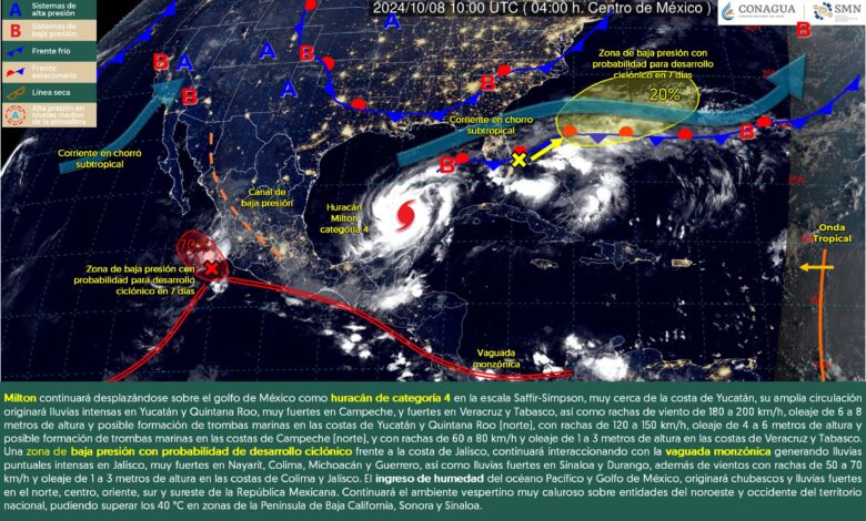 Durante este día, Milton continuará desplazándose sobre el golfo de México como huracán de categoría 4 en la escala Saffir-Simpson, muy cerca de la costa de Yucatán, su amplia circulación originará lluvias intensas en Yucatán y Quintana Roo, muy fuertes en Campeche, y fuertes en Veracruz y Tabasco, así como rachas de viento de 180 a 200 km/h, oleaje de 6 a 8 metros de altura y posible formación de trombas marinas en las costas de Yucatán y Quintana Roo (norte), con rachas de 120 a 150 km/h, oleaje de 4 a 6 metros de altura y posible formación de trombas marinas en las costas de Campeche (norte), y con rachas de 60 a 80 km/h y oleaje de 1 a 3 metros de altura en las costas de Veracruz y Tabasco. A su vez, una zona de baja presión con probabilidad de desarrollo ciclónico frente a la costa de Jalisco, continuará interaccionando con la vaguada monzónica generando lluvias puntuales intensas en Jalisco, muy fuertes en Nayarit, Colima, Michoacán y Guerrero, así como lluvias fuertes en Sinaloa y Durango, además de vientos con rachas de 50 a 70 km/h y oleaje de 1 a 3 metros de altura en las costas de Colima y Jalisco. Por otro lado, el ingreso de humedad del océano Pacífico y Golfo de México, originará chubascos y lluvias fuertes en el norte, centro, oriente, sur y sureste de la República Mexicana. Finalmente, continuará el ambiente vespertino muy caluroso sobre entidades del noroeste y occidente del territorio nacional, pudiendo superar los 40 °C en zonas de la Península de Baja California, Sonora y Sinaloa.
