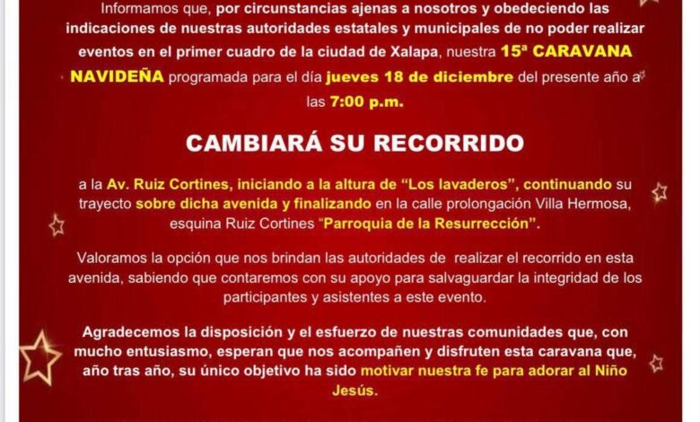 La tradicional Caravana Navideña del Movimiento Católico Nueva Evangelización, que celebra su 15ª edición este jueves 18 de diciembre a las 7:00 de la noche, se verá obligada a cambiar su ruta original. Esta modificación obedece a una instrucción emitida por autoridades estatales y municipales que indicaron la prohibición de realizar desfiles de este tipo en el primer cuadro de la ciudad de Xalapa.