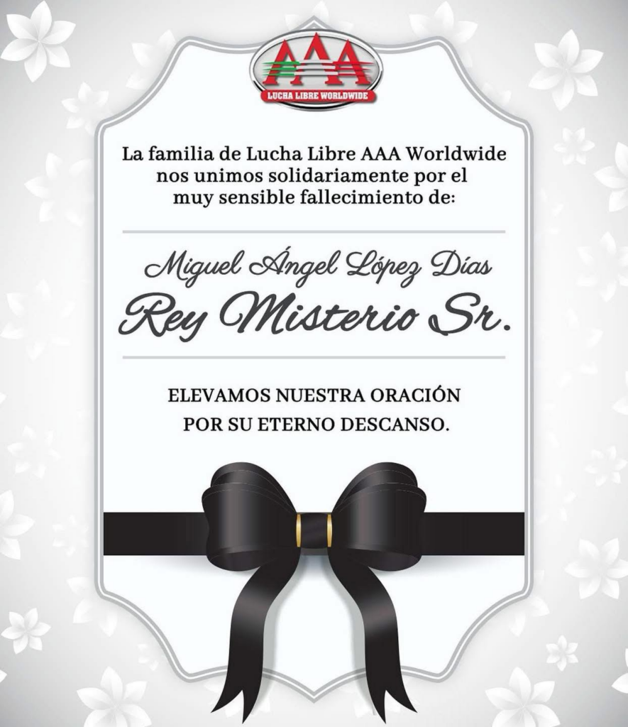 La noticia fue dada a conocer por la AAA, que publicó el mensaje en sus redes sociales: «Lamentamos el sensible fallecimiento de Miguel Ángel López Días, conocido como Rey Mysterio Sr. Enviamos nuestro más sincero pésame a sus seres queridos y elevamos nuestras oraciones al cielo por su eterno descanso».
