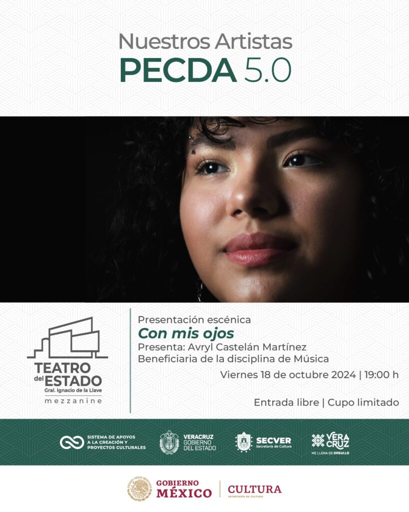 «Con mis ojos» de Avryl Castelan, se presentará este 18 de octubre en el Mezzanine a las 19:00 horas; ya que es un proyecto musical beneficiado por «Pecda» Veracruz.
