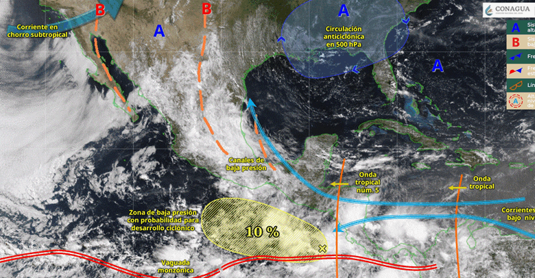 Esto debido a canales de baja presión en la Mesa del Norte, el centro, noreste, oriente y sureste de la República Mexicana, en interacción con divergencia, ingreso de humedad de ambos océanos y la proximidad de la vaguada monzónica, aunados al paso de la onda tropical (núm. 5), la cual continuará asociada con una zona de baja presión con probabilidad para desarrollo ciclónico al sur de Guatemala. Pronosticándose chubascos y lluvias fuertes a muy fuertes en las regiones mencionadas, además de la península de Yucatán, el occidente y sur del país, con lluvias puntuales intensas en Jalisco, Colima, Michoacán, Guerrero, Oaxaca, Chiapas y Veracruz.