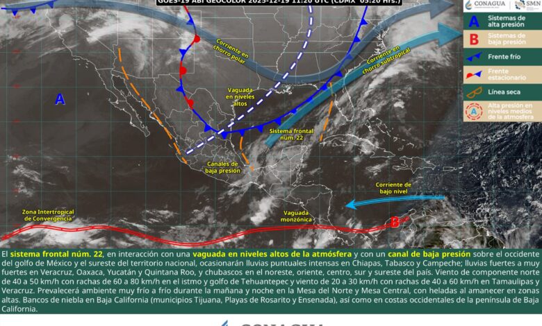 Para hoy, el sistema frontal núm. 22 se extenderá sobre el norte del golfo de México y noreste del país, en interacción con una vaguada en niveles altos de la atmósfera extendida desde el noreste hasta el occidente de México y con un canal de baja presión sobre el occidente del golfo de México y el sureste del territorio nacional ocasionarán lluvias puntuales intensas en Chiapas (norte y este), Tabasco (sur y este) y Campeche (centro y suroeste); lluvias fuertes a muy fuertes en zonas de Veracruz (Papaloapan, Los Tuxtlas y Olmeca), Oaxaca (norte y este), Yucatán y Quintana Roo, así como lluvias con chubascos en zonas del noreste, oriente, centro, sur y sureste del país. A su vez, se prevé viento de componente norte de 40 a 50 km/h con rachas de 60 a 80 km/h en el istmo y golfo de Tehuantepec (Oaxaca y Chiapas) y viento de 20 a 30 km/h con rachas de 40 a 60 km/h en Tamaulipas y Veracruz. Por otro lado, continuará el ambiente muy frío a frío durante la mañana y noche sobre entidades de la Mesa del Norte y la Mesa Central, con heladas al amanecer en zonas altas. Además, se espera la formación de bancos de niebla en Baja California (municipios de Tijuana, Playas de Rosarito y Ensenada), así como en zonas costeras del occidente de la península de Baja California.
