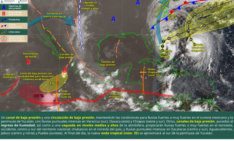 Este día, un canal de baja presión y una circulación de baja presión en superficie sobre el golfo de México, mantendrán las condiciones para lluvias fuertes a muy fuertes en el sureste mexicano y la península de Yucatán, con lluvias puntuales intensas en Veracruz (sur), Oaxaca (este) y Chiapas (oeste y sur). Otros, canales de baja presión sobre el noroeste, occidente, centro y sur del territorio nacional, aunados al ingreso de humedad del océano Pacífico y golfo de México, así como a una vaguada en niveles medios y altos de la atmósfera, que se posicionará sobre los estados de la Mesa del Norte, propiciarán lluvias fuertes a muy fuertes en las regiones mencionadas, así como chubascos en el noreste del país, además de lluvias puntuales intensas en Zacatecas (centro y sur), Aguascalientes, Jalisco (centro y norte) y Puebla (sureste). Finalmente, continuará el ambiente cálido a caluroso durante la tarde sobre la mayor parte del territorio mexicano con temperaturas de 35 a 40 °C en Baja California, Baja California Sur, Sonora, Jalisco, Colima, Michoacán y Oaxaca, pudiendo superar los 40 °C en Sinaloa. Al final del día, la nueva onda tropical (núm. 35) se aproximará al sur de la península de Yucatán.