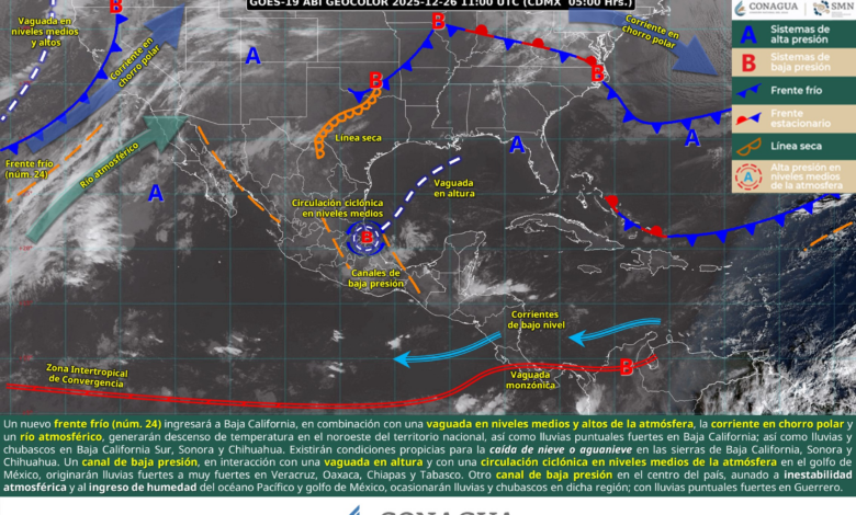 Este día, un nuevo frente frío (núm. 24) ingresará a Baja California, en combinación con una vaguada en niveles medios y altos de la atmósfera, la corriente en chorro polar y un río atmosférico, generarán descenso de temperatura en el noroeste del territorio nacional, así como lluvias puntuales fuertes en Baja California; adicionalmente lluvias y chubascos en Baja California Sur, Sonora y Chihuahua. Asimismo, existirán condiciones propicias para la caída de nieve o aguanieve en las sierras de Baja California, Sonora y Chihuahua. Por otra parte, un canal de baja presión sobre el sureste mexicano y la península de Yucatán, en interacción con una vaguada en altura y con una circulación ciclónica en niveles medios de la atmósfera en el golfo de México, originarán lluvias fuertes a muy fuertes en Puebla, Veracruz, Oaxaca, Chiapas y Tabasco. Simultáneamente, un canal de baja presión en el centro del país, aunado a inestabilidad atmosférica y al ingreso de humedad del océano Pacífico y golfo de México, ocasionarán lluvias y chubascos en dicha región; con lluvias puntuales fuertes en Guerrero.