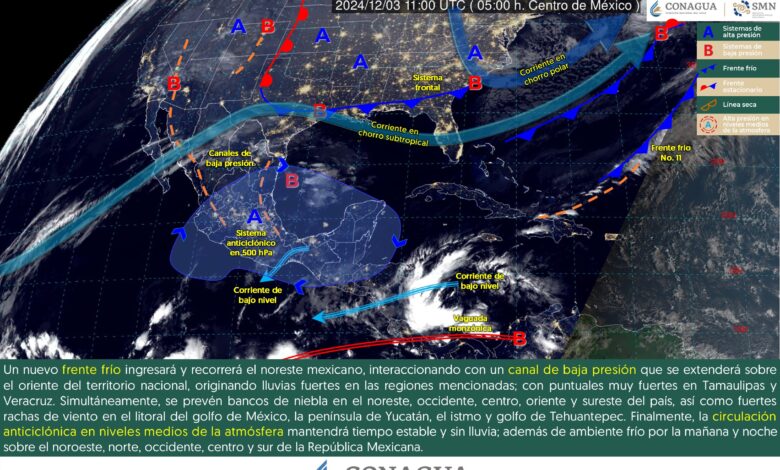 Para este día, un nuevo frente frío ingresará y recorrerá el noreste mexicano, interaccionando con un canal de baja presión que se extenderá sobre el oriente del territorio nacional, originando lluvias fuertes en las regiones mencionadas; con puntuales muy fuertes en Tamaulipas y Veracruz. Simultáneamente, se prevén bancos de niebla en el noreste, occidente, centro, oriente y sureste del país, así como fuertes rachas de viento en el litoral del golfo de México, la península de Yucatán, el istmo y golfo de Tehuantepec. Finalmente, la circulación anticiclónica en niveles medios de la atmósfera mantendrá tiempo estable y sin lluvia; además de ambiente frío por la mañana y noche sobre el noroeste, norte, occidente, centro y sur de la República Mexicana.