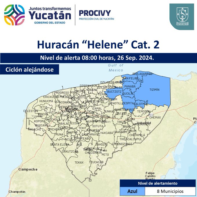 La Coordinación de Protección Civil de Yucatán (Procivy) informó que, con la lejanía del huracán Helene, se ha emitido Alerta Azul para ocho municipios del oriente del estado: Tizimín, Río Lagartos, San Felipe, Panabá, Sucilá, Buctzotz, Espita y Calotmul.